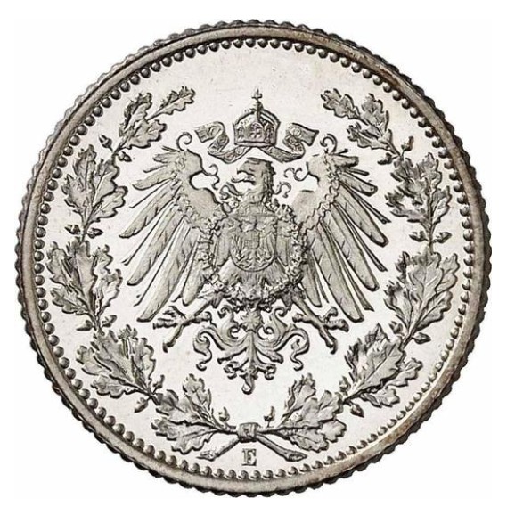 Moneta została wykonana ze srebra próby 900, co potwierdza jej wysoką jakość i szlachetny charakter. Średnica wynosi około 20 milimetrów, a waga to nieco ponad 2,5 grama. Na awersie widnieje majestatyczny cesarski orzeł niemiecki – symbol władzy, jedności i suwerenności państwa. Rewers zdobi napis „1/2 MARK” otoczony misternie wykonanym wieńcem z liści dębu, który w niemieckiej symbolice oznacza siłę, trwałość i dumę narodową. W górnej części rewersu widnieje napis „DEUTSCHES REICH”, natomiast na samym dole rok wybicia monety. Całość tworzy harmonijną i elegancką kompozycję, charakterystyczną dla niemieckich monet z początku XX wieku.
