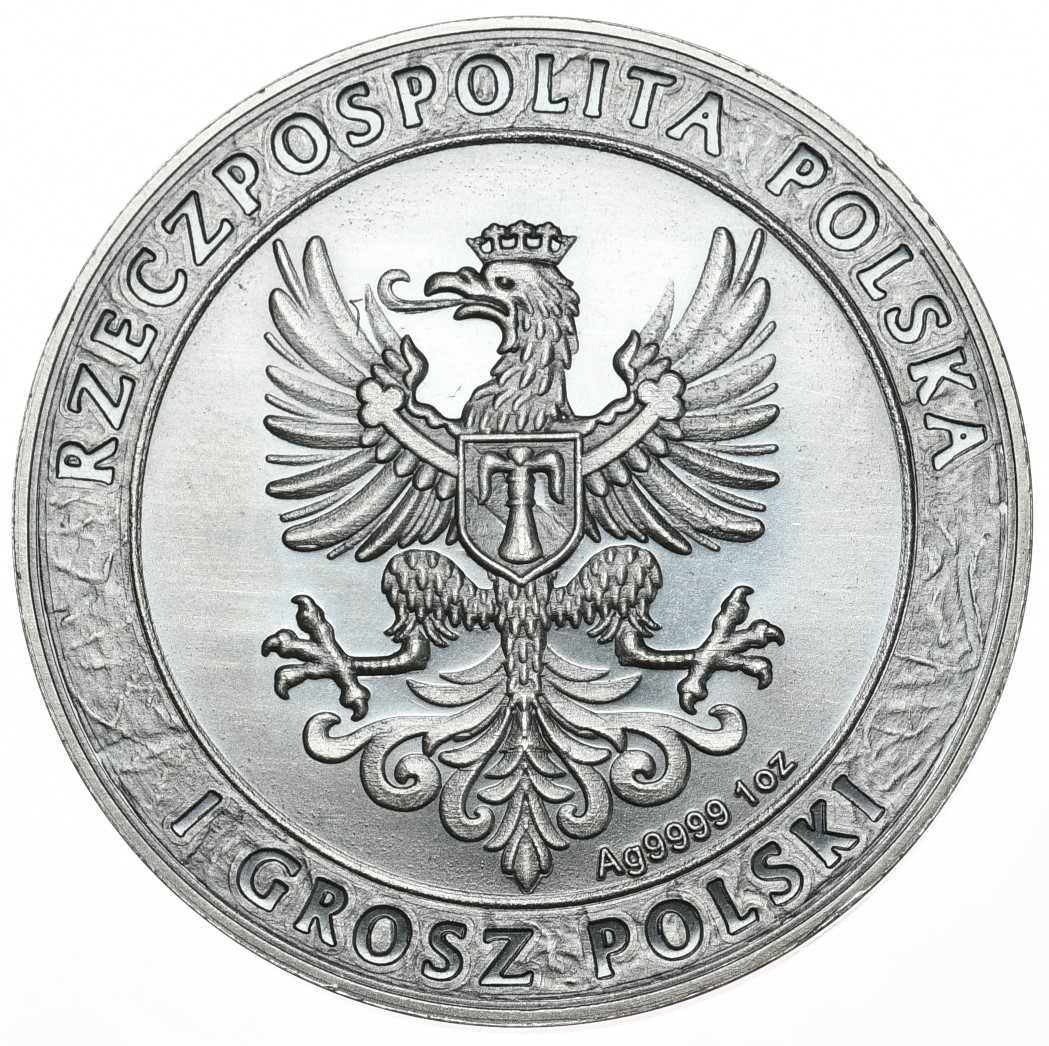 Na awersie w centralnej części znajduje się godło Rzeczpospolitej. W dolnej znajduje się metryczka z opisem metalu i jego próby: w tym przypadku Ag 9999 1 oz. W górnej części otoku awersu widnieje napis Rzeczpospolita polska, natomiast w dolnej nominał monety – 1 grosz polski.