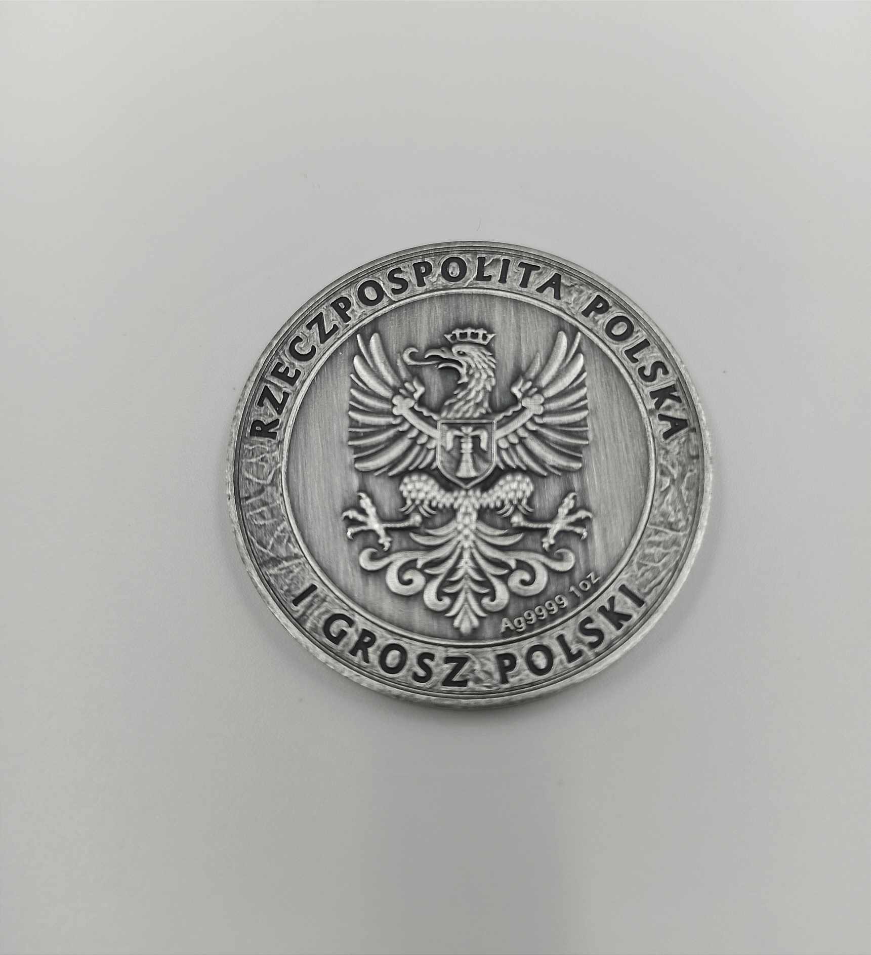 Na awersie w centralnej części znajduje się godło Rzeczpospolitej. W dolnej części została umiejscowiona metryczka z opisem metalu i jego próby: w tym przypadku Ag 9999 1 oz. W górnej części otoku awersu widnieje napis Rzeczpospolita polska, natomiast w dolnej nominał monety – 1 grosz polski.