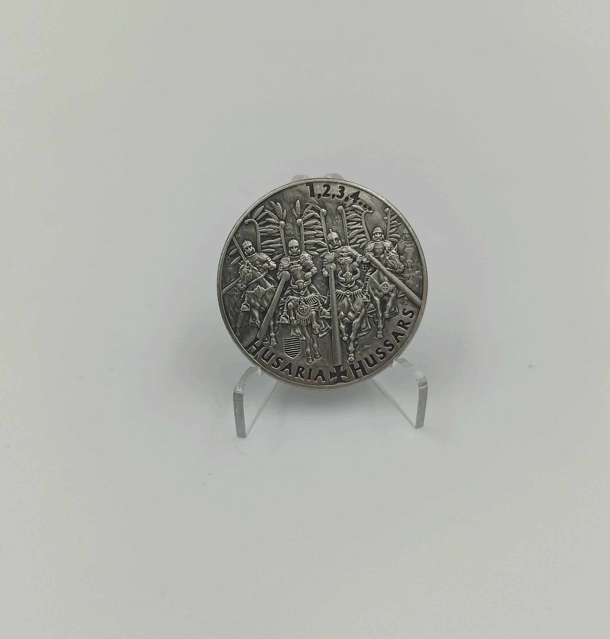 Rewers tej monety przedstawia szarżę jazdy husarskiej. W pierwszej linii widzimy czterech rycerzy pędzących na koniach z wyciągniętymi przed siebie kopiami. Za nimi można dostrzec kolejnych wojowników. W dolnej części rewersu znajduje się dwujęzyczny napisz – Husaria + Hussars. Nad piórami husarzy mamy informację o numeracji monety 1,2,3,4… Jedynka jest tutaj pogrubiona, ponieważ jest to pierwsza moneta z serii. Wielokropek oznacza że seria jest otwarta.
