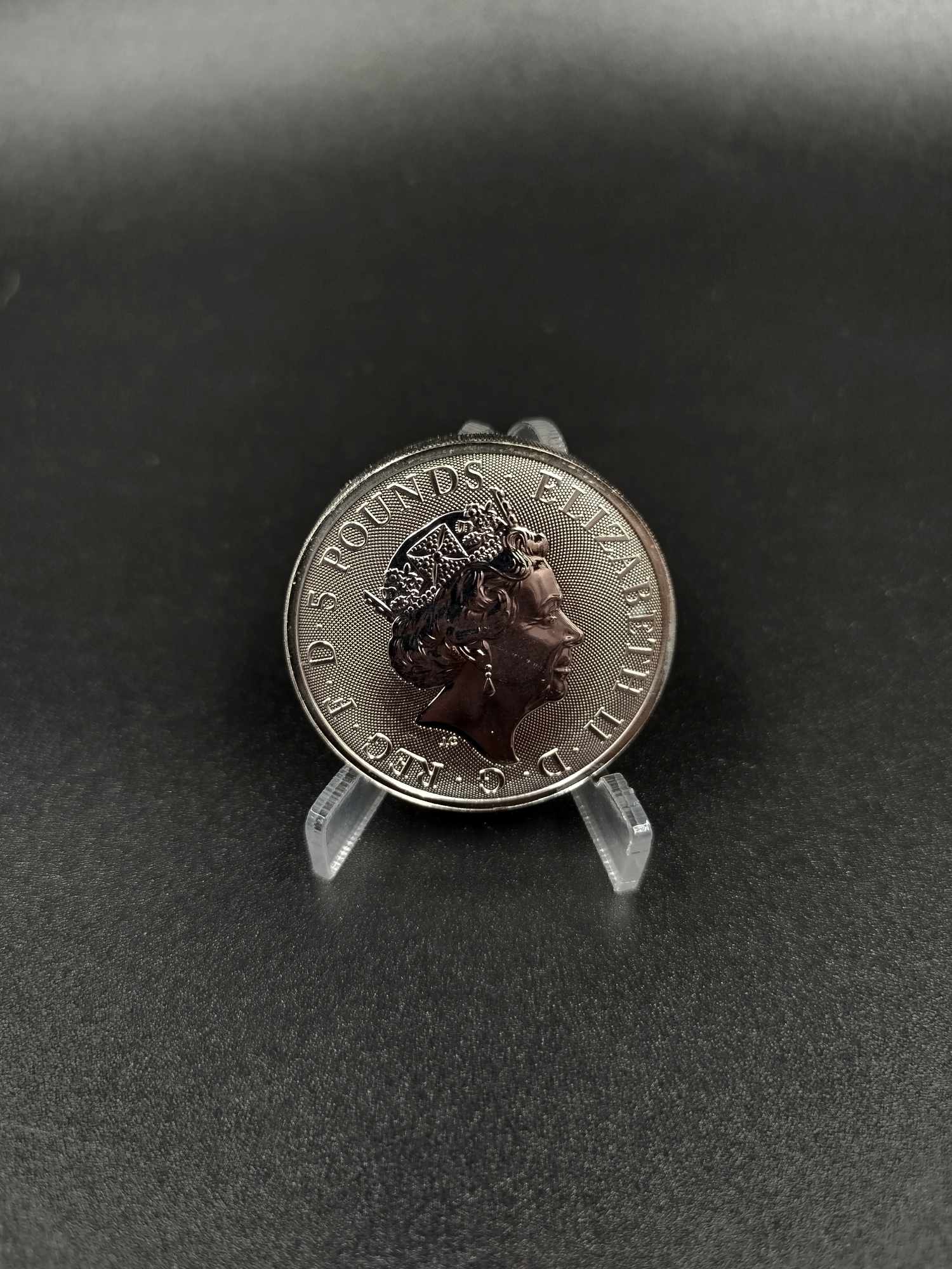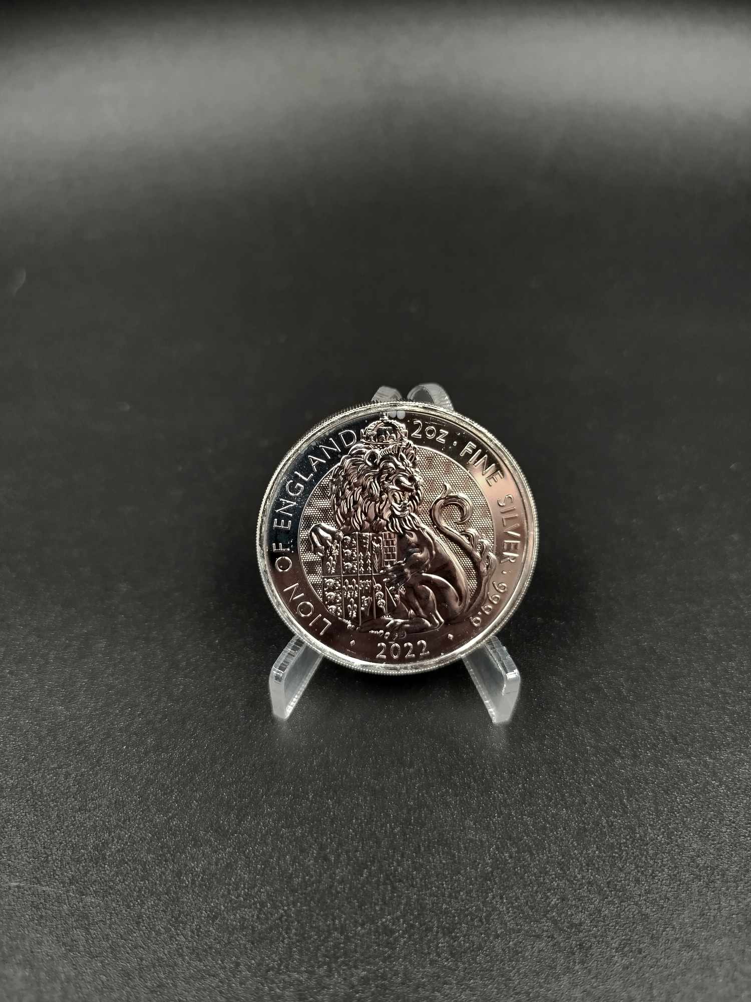 Rewers monety przedstawia potężnego Lwa Anglii, jedno z najbardziej ikonicznych zwierząt heraldycznych związanych z dynastią Tudorów. Lew trzyma tarczę z królewskim herbem, co symbolizuje siłę i królewską władzę. Wzór rewersu jest niezwykle szczegółowy, z dbałością o detale, co sprawia, że moneta jest atrakcyjna nie tylko dla inwestorów, ale także dla kolekcjonerów.