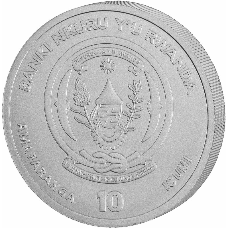 Na awersie monety widnieje herb Rwandy otoczony tradycyjnymi motywami afrykańskimi. Wokół umieszczono informacje o kraju emisji, nominale, próbie srebra oraz wadze monety. Kompozycja jest symetryczna i elegancka, podkreślając oficjalny charakter emisji.