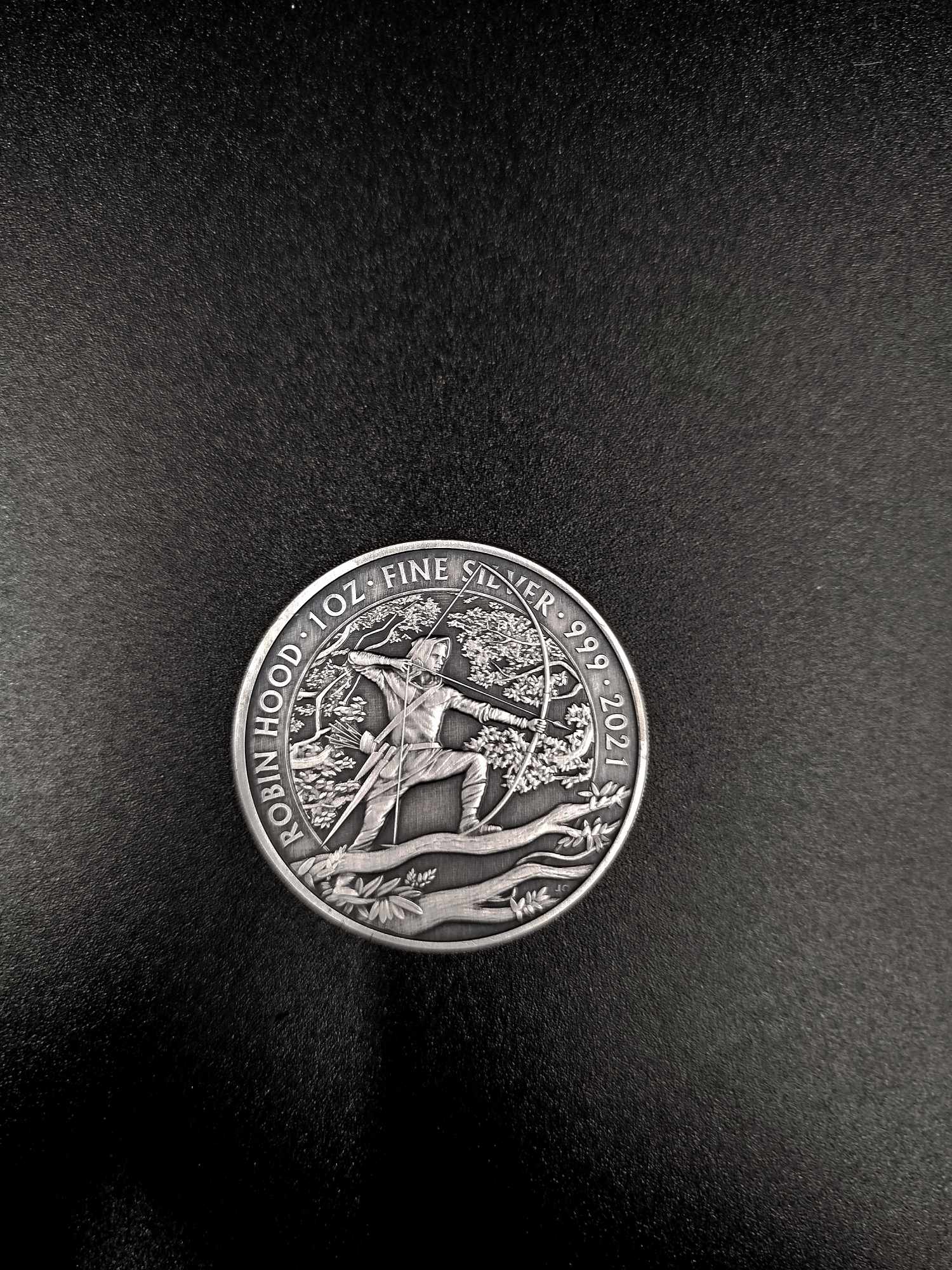 Srebrny Robin Hood 2021, to pierwsza moneta z serii Myths & Legends, wydanej przez mennicę The Royal Mint. Tematyką tej serii są fikcyjni bohaterowie, którzy pojawiają się w licznych brytyjskich legendach i opowieściach. Robin Hood jest jednym z najbardziej znanych bohaterów ludowych w historii Anglii i jest głównym bohaterem wielu mówionych opowieści, ballad i legend. Te mity i legendy skupiają się na jego postaci jako buntownika, sprawiedliwego rozbójnika i obrońcy ubogich. Robin Hood jest jednym z tych bohaterów, którzy stali się ikonami walki przeciwko niesprawiedliwości społecznej i uciskowi, a jego legendy nadal są popularne i wpływowe w kulturze zachodniej.