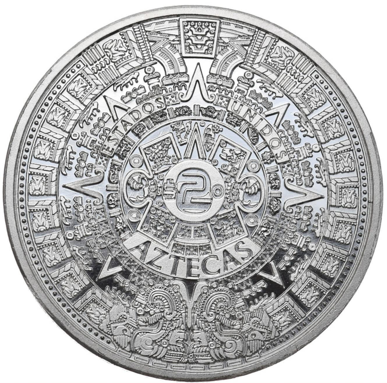 Druga strona monety prezentuje kalendarz aztecki w formie koncentrycznego reliefu pełnego symboli i znaków. Centralnym elementem jest stylizowane słońce, otoczone pierścieniami z glifami odnoszącymi się do dni, cykli czasu oraz mitologii azteckiej. Całość została wykonana z dużą precyzją, co sprawia, że moneta przyciąga uwagę nawet przy bliższym oglądzie.